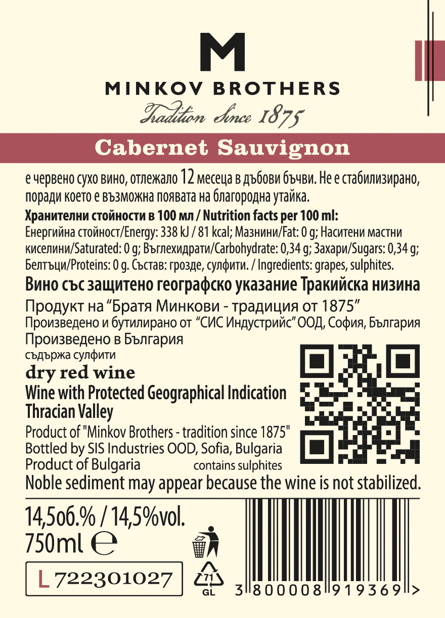 Вкус: плътен и заоблен, с усещане за сочност, мека свежест и гладки танини, с дълъг финал, с аромати на шоколад и зрели горски плодове.